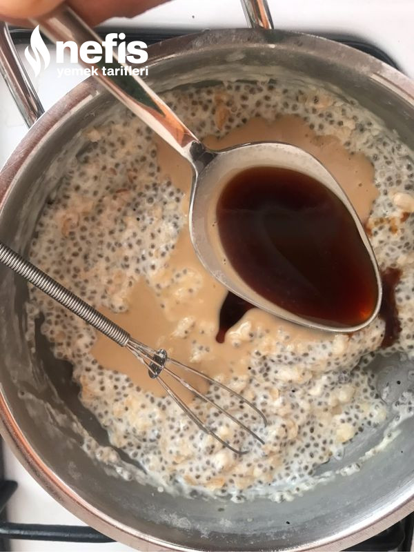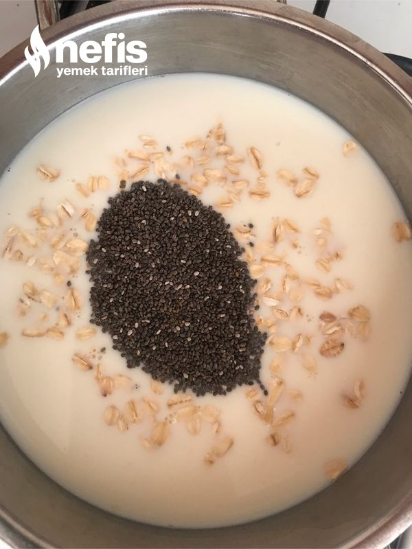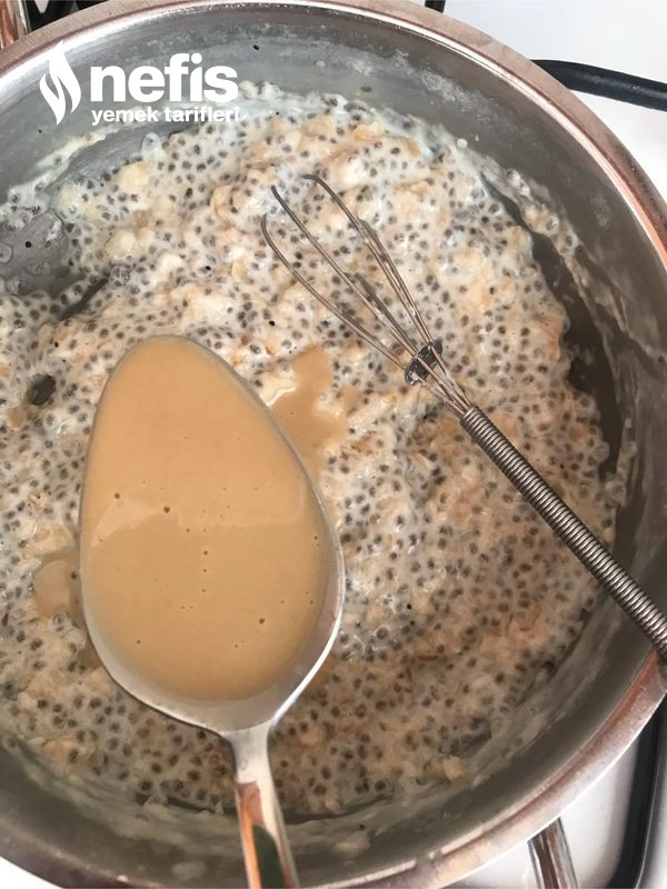 1. Sütü yulafla küçük sos tenceresinde pişirelim içine chia tohumunu da ekleyelim. Kaynayınca altını kısıp katılaşıncaya kadar ocakta yavaş yavaş karıştıralım. Kaldırmaya yakın tahin ve pekmezi ekleyelim.