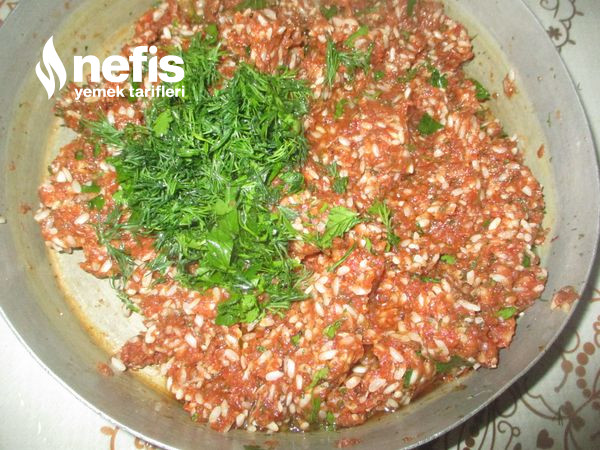 3. Kıymayı koyalım, pirinçi ılık tuzlu suda beş dakika bekletelim yıkayalım, süzelim o denli koyalım.