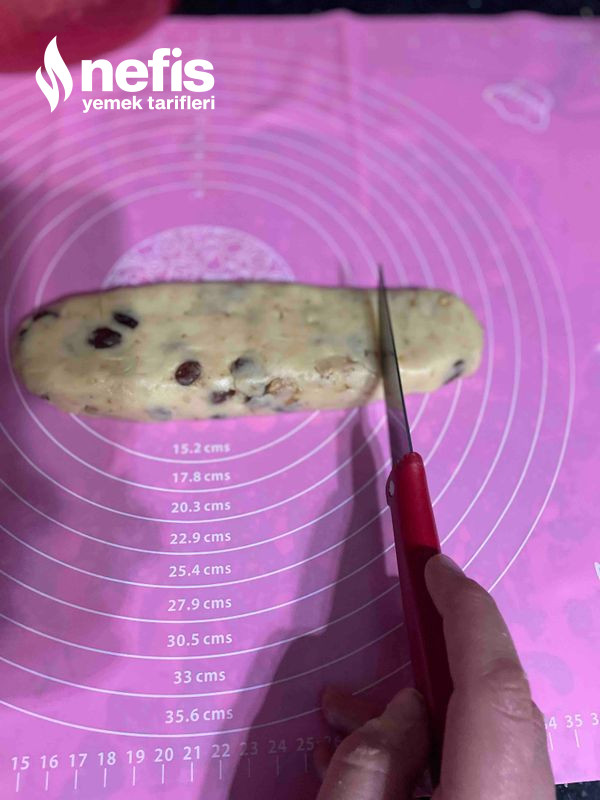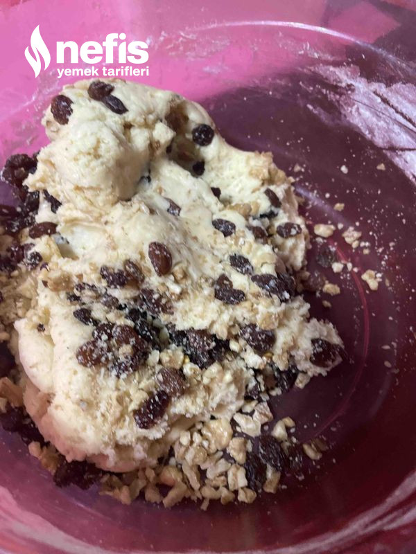 - Ceviz ile kuru üzüm de eklendikten sonra hamur tekrar yoğrulur ve formlar verilir. Yağlı kağıt serili fırın tepsisine hamurlar yerleştirilir.
