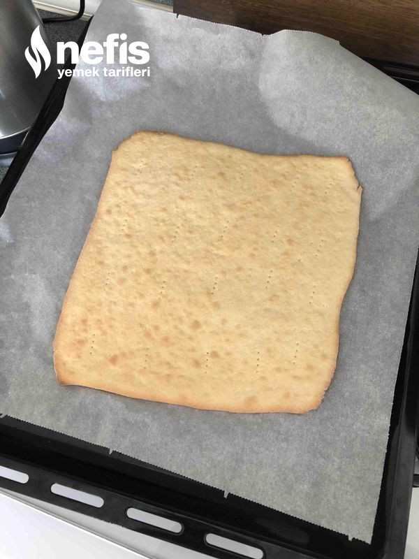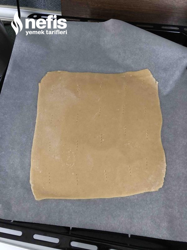 - Dinlenen hamur 4 beze yapıp büyük pasta tabağı büyüklüğünde açın kare kalıba nazaran ölçüp kenarlarından kestim ben ve pişirme kağıdına koyup çatalla delip, 180 derece fırında 10 dk pişirdim hafif pembeleşince pişmiş oluyor.