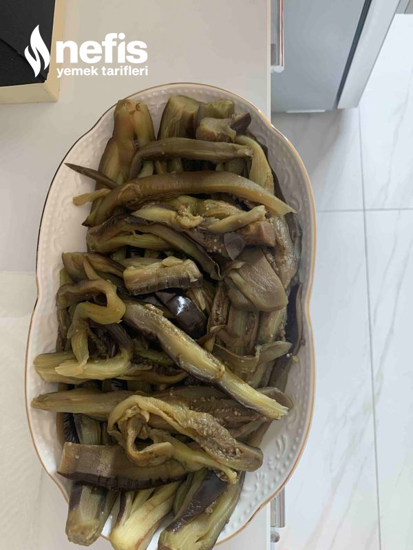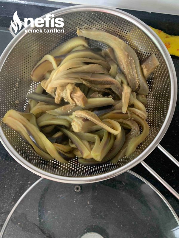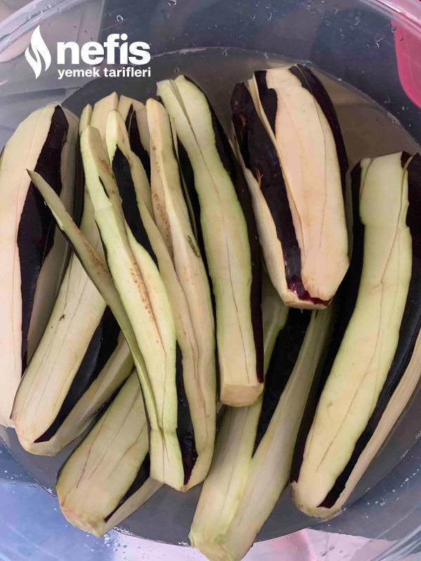 2. Patlıcanların başlarını kopartıp, pijama üzere kabuğunu soyup; uzunlumasına 4’e kesiyoruz.
