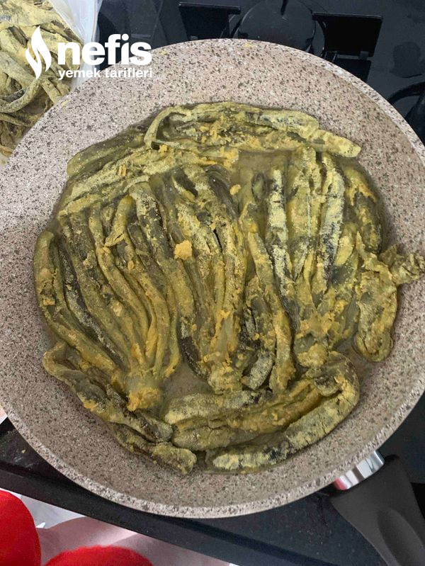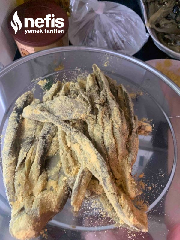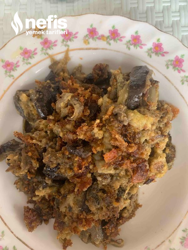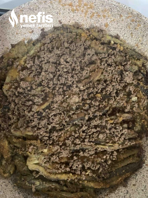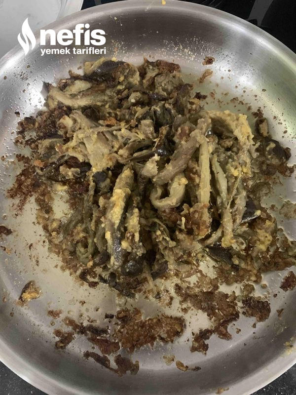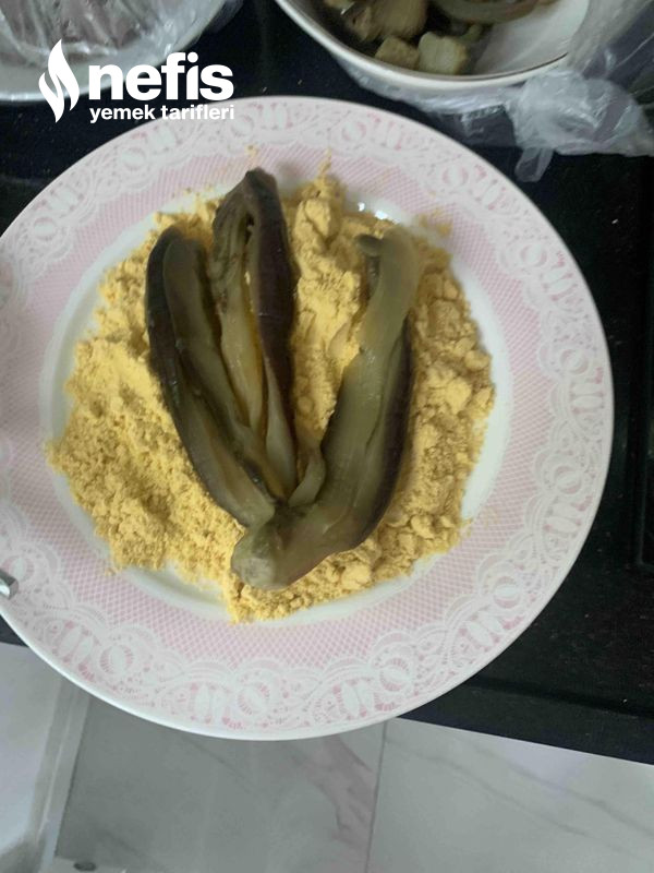 4. Haşlanmış patlıcanın suyunu süzüp, bir kaba alıyoruz. Yiyeceğimiz vakit, mısır unu ile alt üst sürüp; bir tarağı kızarttıktan sonra başka tarafı kıyma ile birlikte kızartıyoruz.