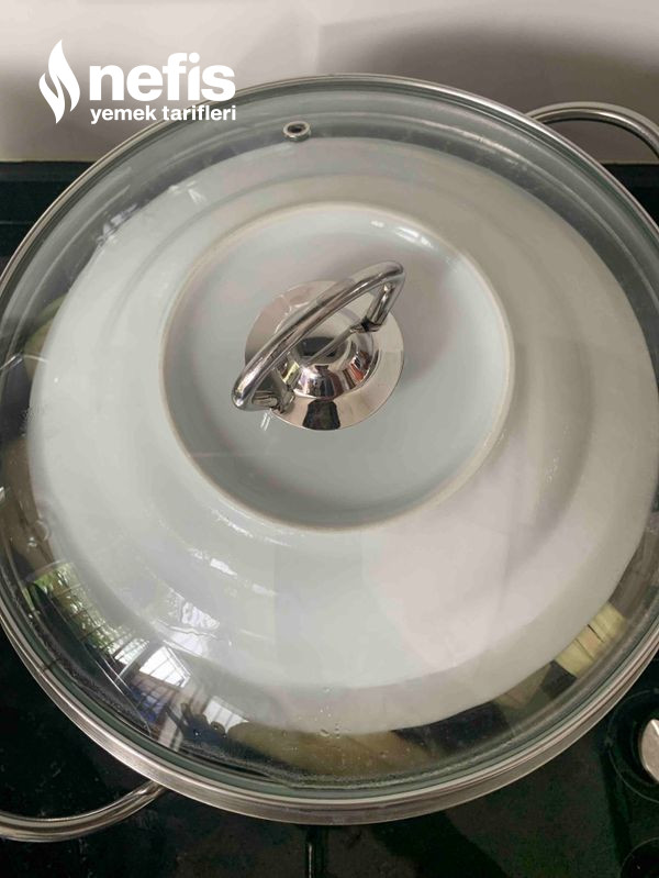 3. Tencereye su koyup, kaynattıktan sonra 1 yemek kaşığı ucu tuz koyup; patlıcanları ekleyip tekrar haşlıyoruz. Annem haşlarken tencerenin kapağının altına tabak koyup kapağını kapatarak haşlıyor.