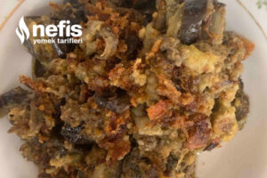 4. Haşlanmış patlıcanın suyunu süzüp, bir kaba alıyoruz. Yiyeceğimiz vakit, mısır unu ile alt üst sürüp; bir tarağı kızarttıktan sonra başka tarafı kıyma ile birlikte kızartıyoruz.