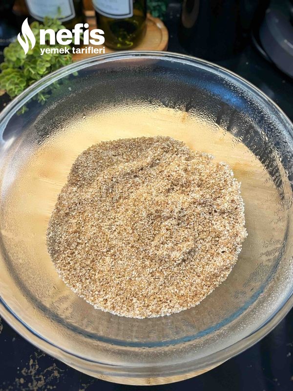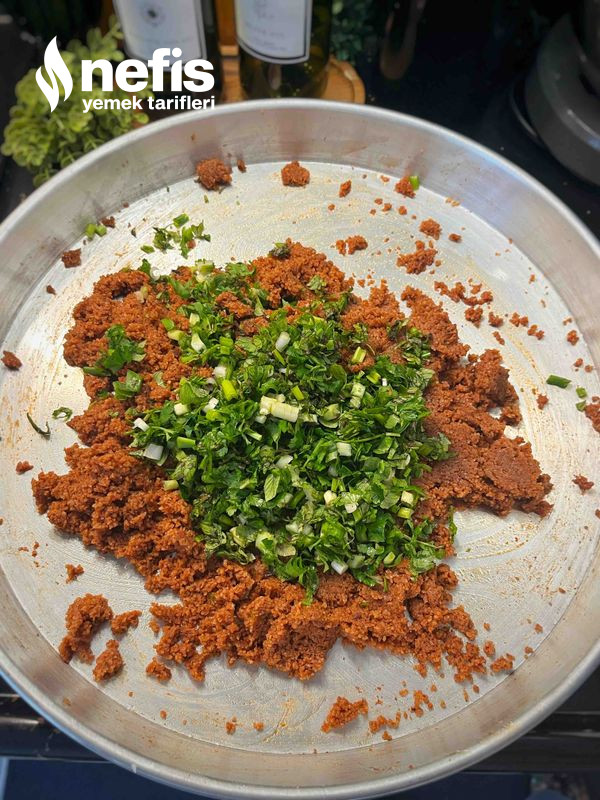 - Normalde soğuk su ile yoğurularak yapılır lakin ben kolaylık olsun diye bulguru 2 su bardağı sıcak suyla ıslatıp o denli hazırladım.