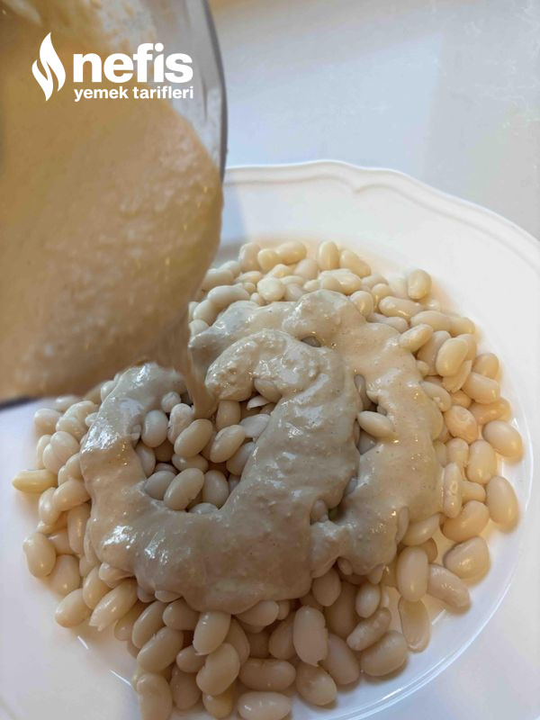 2. Servis tabağına evvel haşlanmış kuru fasulyeyi alalım ve rondodan geçirdiğiniz tahinli sosu her tarafına gelecek formda dökelim,.