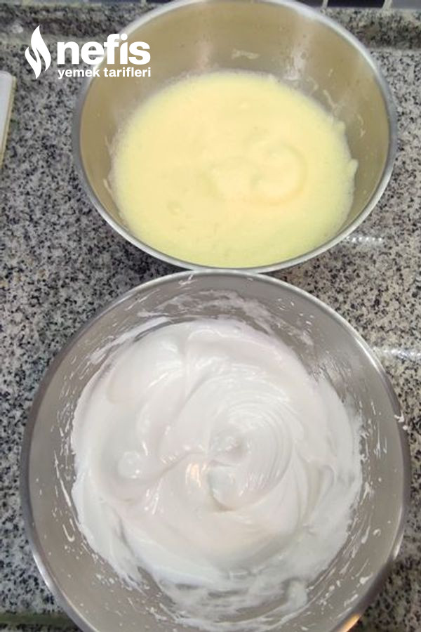 3. Çıktığımız sarıları 2-3 seferde beyazlara spatulayla alttan üste hakikat karıştırarak ekleyelim. Sarılar ve aklar birbirine karıştırdıktan sonra elenmis bir buçuk su bardağı unu, kabartma tozu ve bir paket vanilyayi 3 seferde spatulayla tekrar alttan üste karıştırarak karışımı söndürmeden karıştıralım.