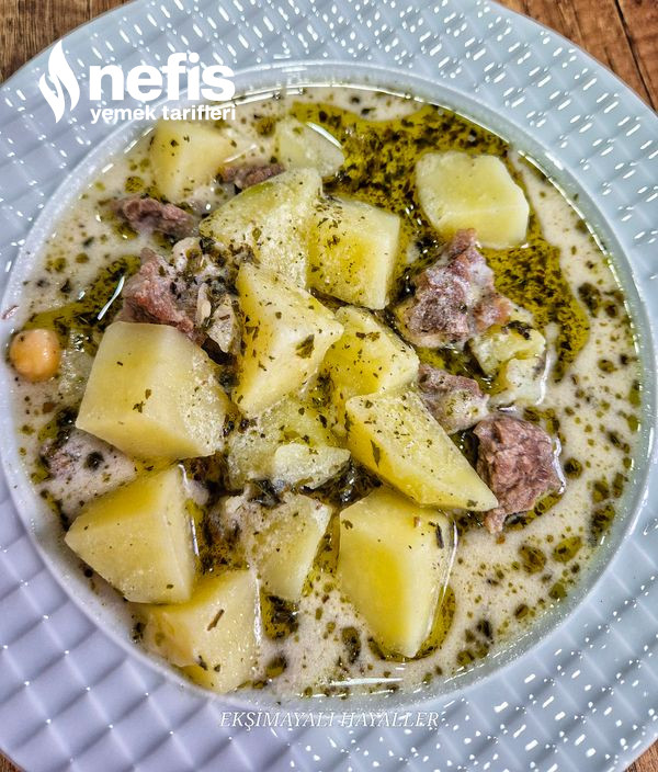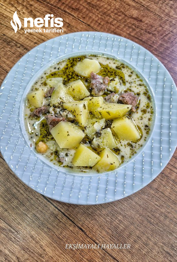 - Et 2 litre su ile düzgünce yumuşayana dek haşlanır. O ortada terbiyesi için gereken materyaller bir tencereye alınır ve karıştırılarak kaynatılır altı kapatılır haşlanan et içerisine patatesler eklenir, patatesler biraz yumuşayınca nohutlar eklenir.