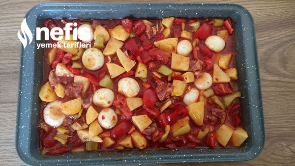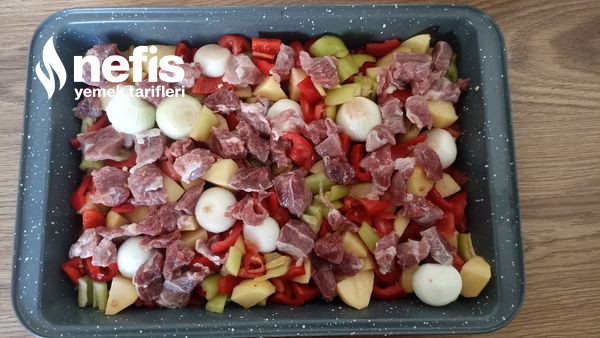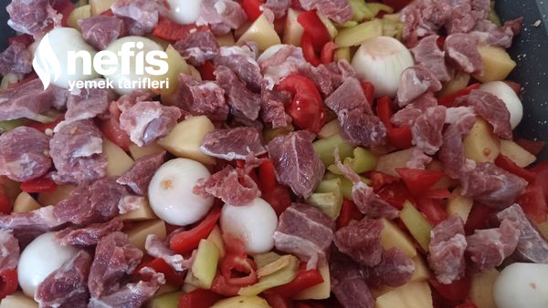 2. Üzerine kuşbaşı etlerimizi sebzelerimizin üzerine diziyoruz.