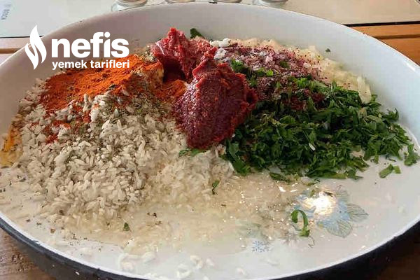 - İç harcı için yıkanan pirinçin üzerine öteki tüm gereçleri ekleyip güzelce harmanlayalım. (karıştırırken mükemmel bir koku yayılacak😋).