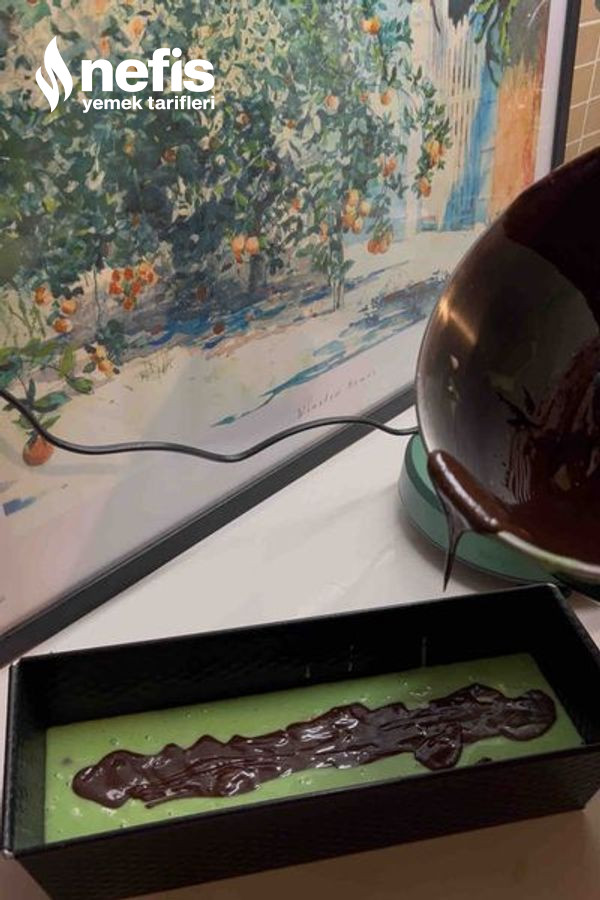 - Karışımı yağlanmış kek kalıbına döküp az bir ölçü ayırıyoruz. Ayırdığımız harcın içine kakaoyu döküp çırpıyoruz. Bu kakaolu karışımı kekin ortasına bir çizgi biçiminde döküyoruz.