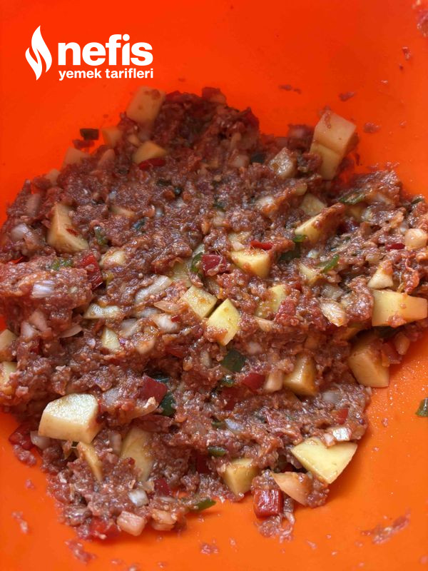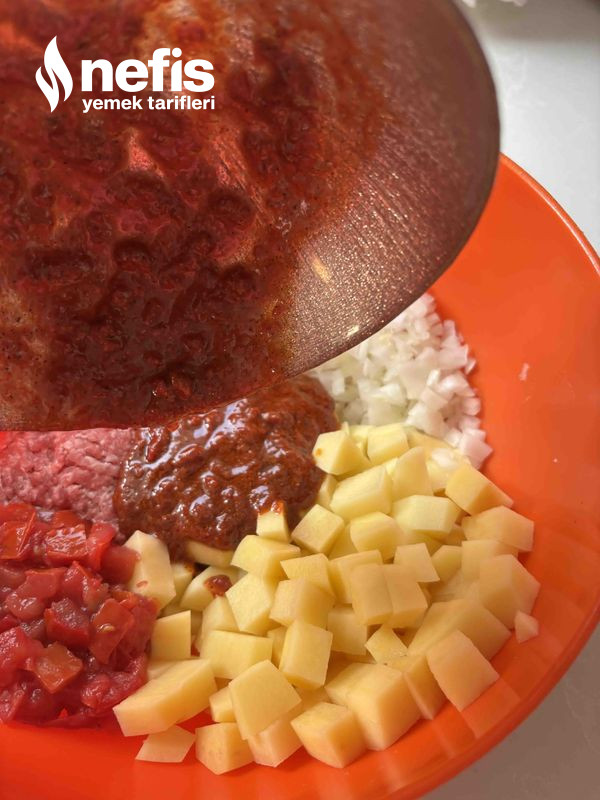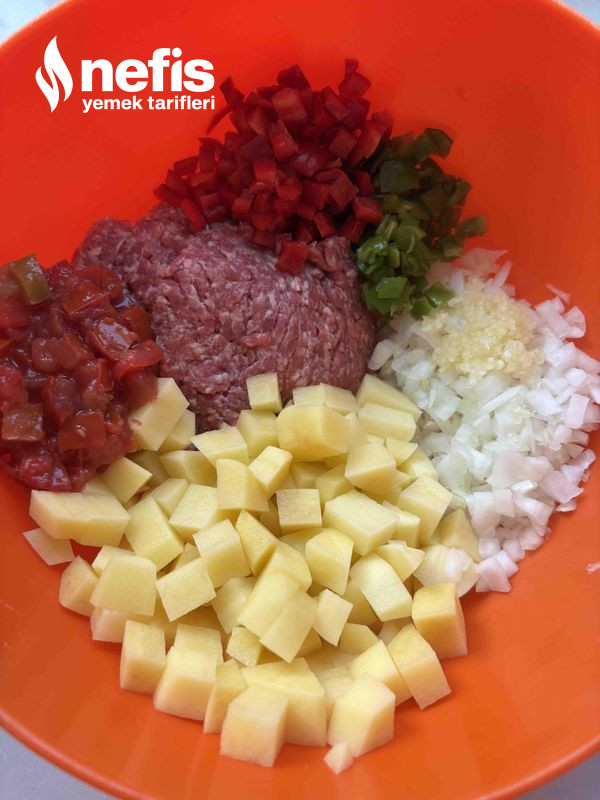 1. Patates ve domatesin kabuklarını soyup küçük küp küp doğrayın, kuru soğanı minik yemeklik doğrayın, biberleri de minik minik doğrayın ve tüm bu gereçleri çukur bir kaba aktaralım sarımsağı ve kıymayı da sebzelerin üzerine ekleyin.