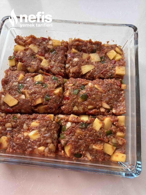 2. Bir kaseye sosu hazırlamak için salçaları, zeytinyağ, su, tuz ve baharatları aktarıp karıştırın bu sosu kıymalı sebzeli karışıma dökelim ve güzelce karıştıralım.