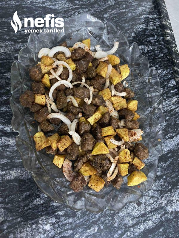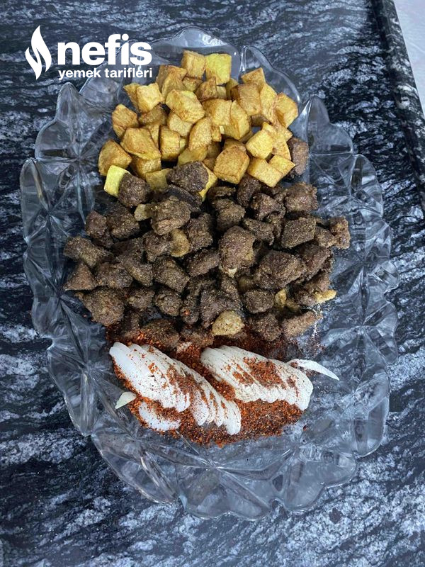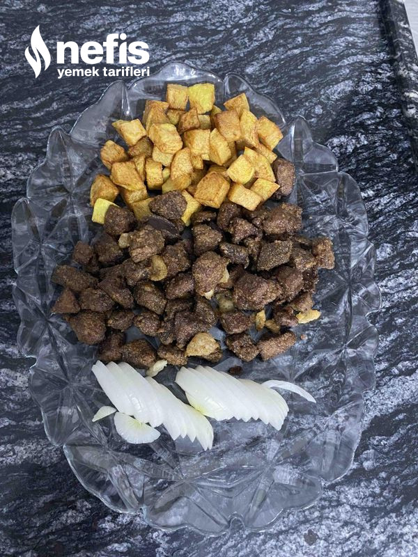 10. Servis yapacağımız tabağa bir adet soğanı doğrayalım, patates ve ciğeri de katıp tuzunu kırmızı biberini atıp karıştıralım şimdiden afiyet olsun.