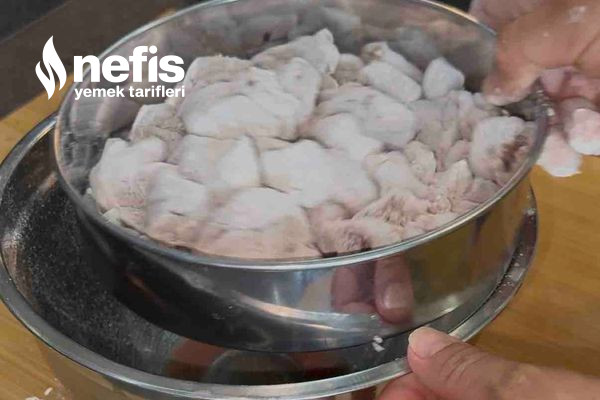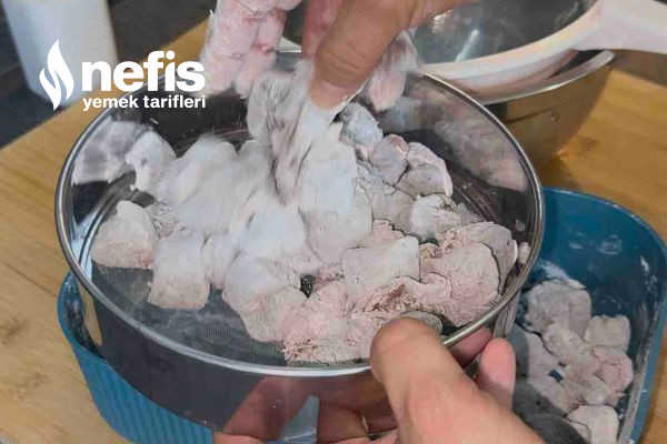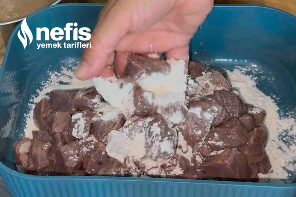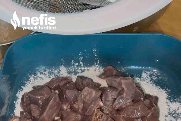 - Süzülen ciğerleri una bulayın ve unun fazlalığını kevgire alıp sallayın çok unlu kalmasın.