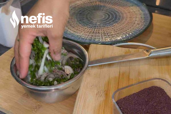 - Soğan salatası için soğanları halka halka doğrayıp ince kıyım maydanoz ve sumakla harmanlayın.