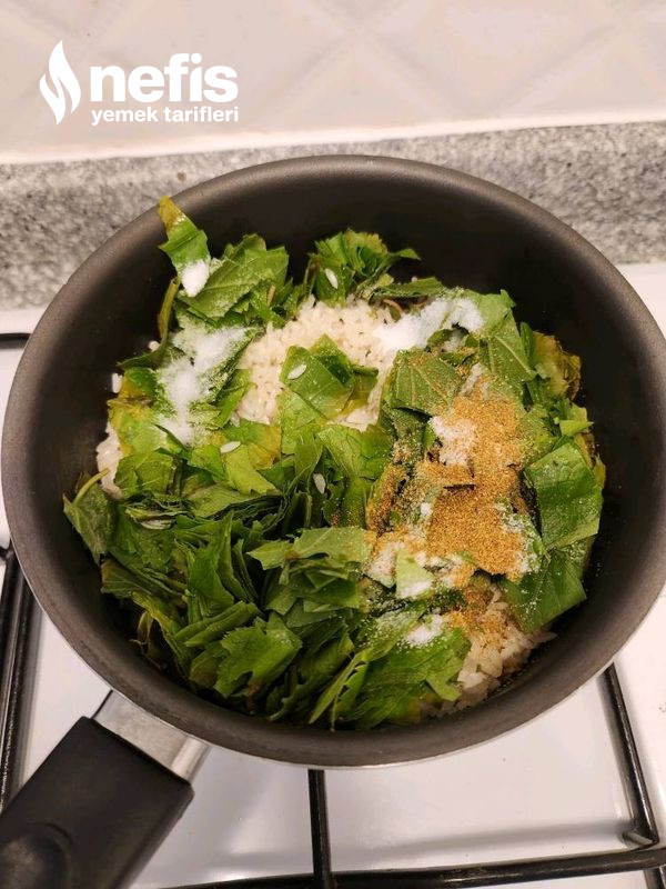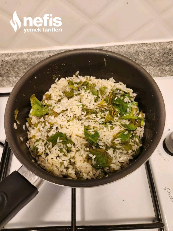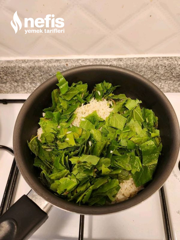 - Kavrulan pirinçlere küçük küçük doğranmış yapraklar ek edilir.