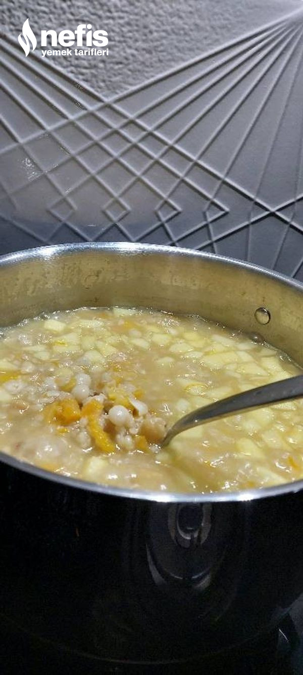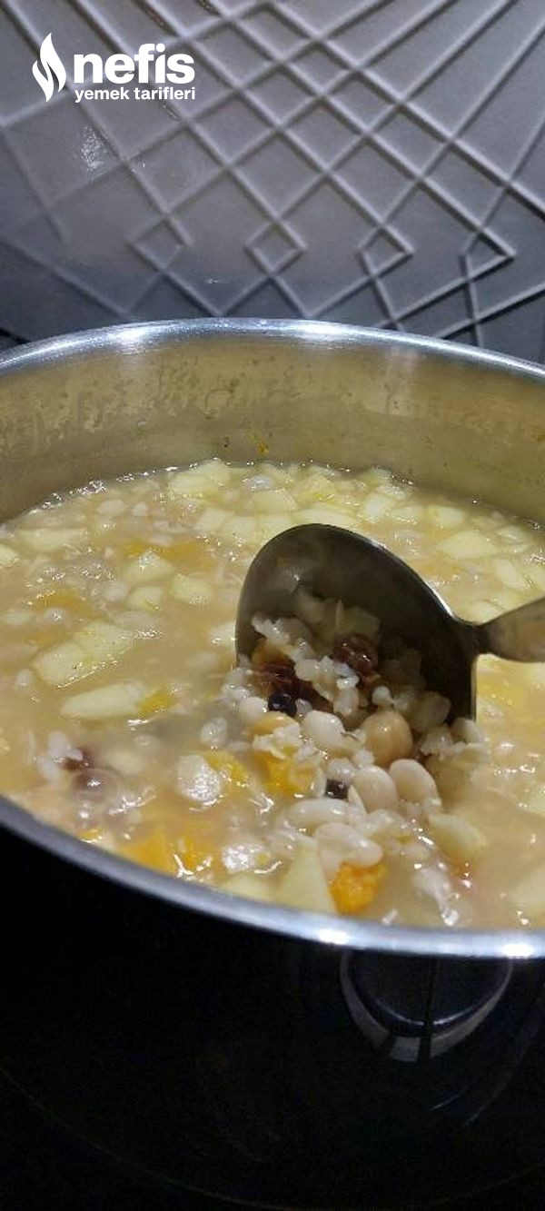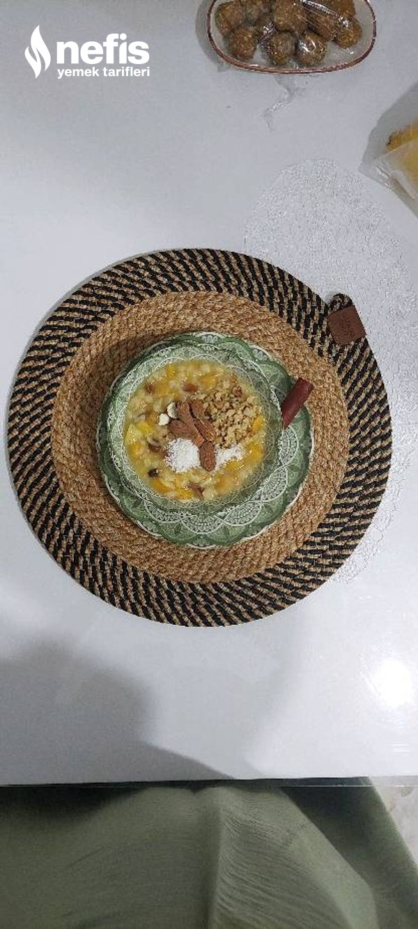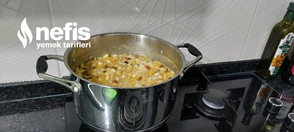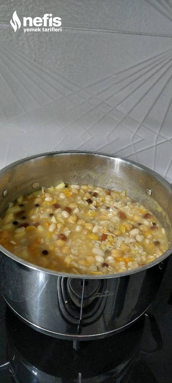 - Kaynayan tencereye evvel pirinç akabinde elma, portakal rendesi, kayısı, üzüm, kuş üzümü, hindistan cevizi, fındık, kök tarçın koyulur. Yarım su bardağında kaynayan karanfil süzülüp tencereye dökülür. 2 yemek kaşığı gül suyu dökülür.