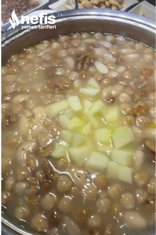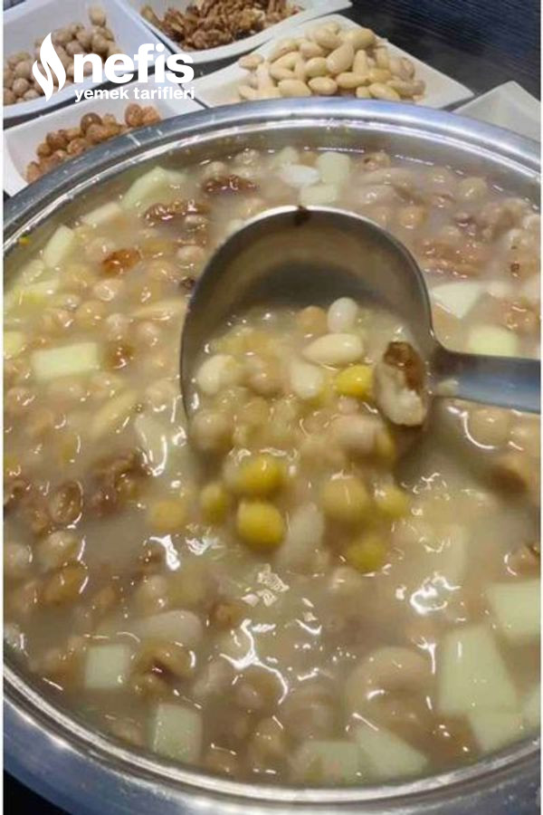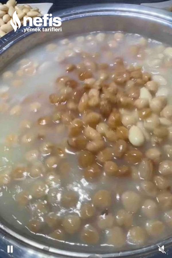 5. Akşamdan sıcak suda bekletilmiş badem, fındık ceviz ve kuru üzümü bir kaç kez yıkayıp süzüp çorbaya ekleyelim.