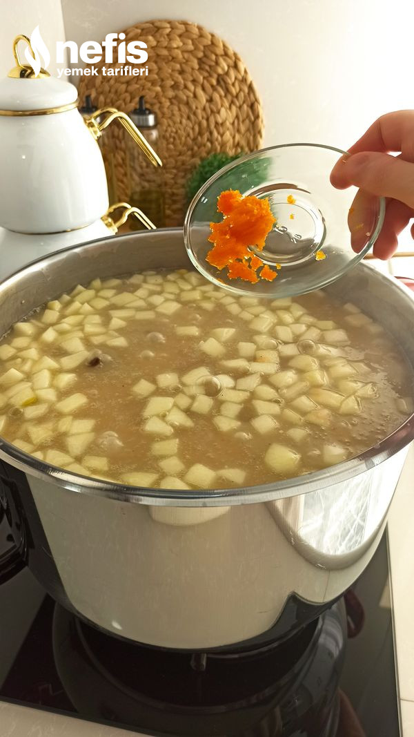 - Üzümler şişmeye başlayınca doğranmış kayısılar ve kuş üzümü eklenir.