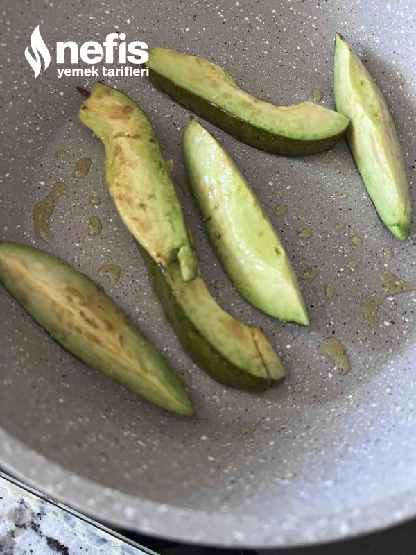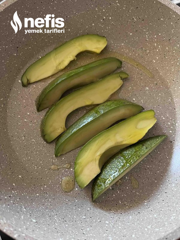 1. Avakadoyu soymadan dilimleyip tavaya alın, üzerine zeytinyağı gezdirip artlı önlü güzelce kızartın ,altını kapatılması için kenara alın.