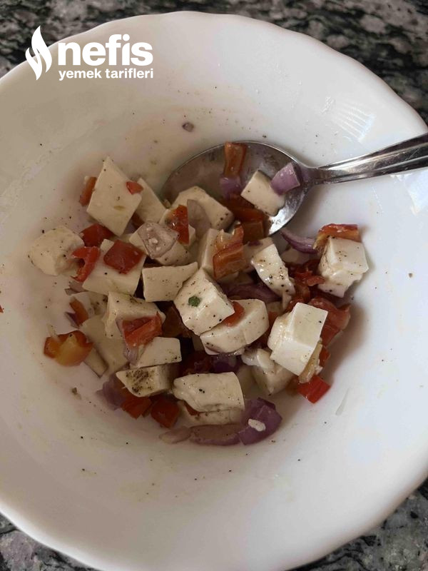 3. Daha sonra soğan kapya biber ve peyniri küp halinde doğrayıp üzerine tuz karabiber zeytinyağı katıp karıştırın.
