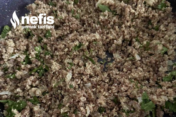 3. Maydanozu doğrayıp ekleyelim ,bir kasede ince bulguru çok az sıcak su ile ıslatıp yumuşatalım ve onu da kıymalı harca ekleyelim.