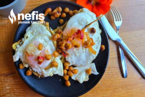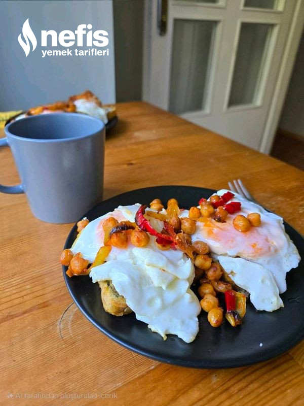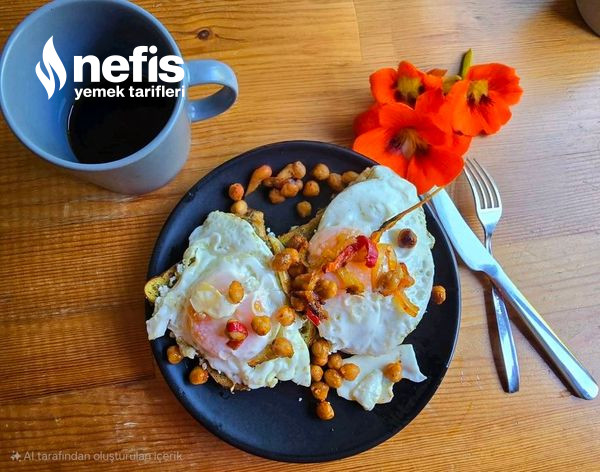5. Pişen yumurtalarımızı olacaktan alarak dilim ekmeklerin üzerine birer adet koyalım. İstediğiniz üzere süsleyebilirsiniz. Tatlı çay kaşığı tatlı toz biberi üzerine serpin. Ben fırınladığım nohutları koydum. Afiyet olsun 🙂
