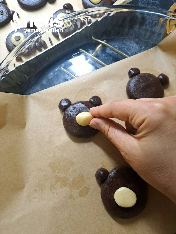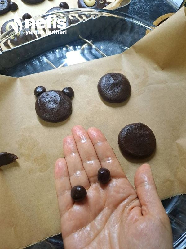 - Yuvarladığımız baş kısmını elimizle yavaşça bastıralım. Kulakları büyük yuvarlağa yavaşça yapıştıralım. Daha sonra beyaz hamurdan burnunu yapalım. Ucuna damla çikolata konduralım. Gözleri için evvel beyaz hamur yuvarlayalım, ortasına siyah hamur konduralım.
