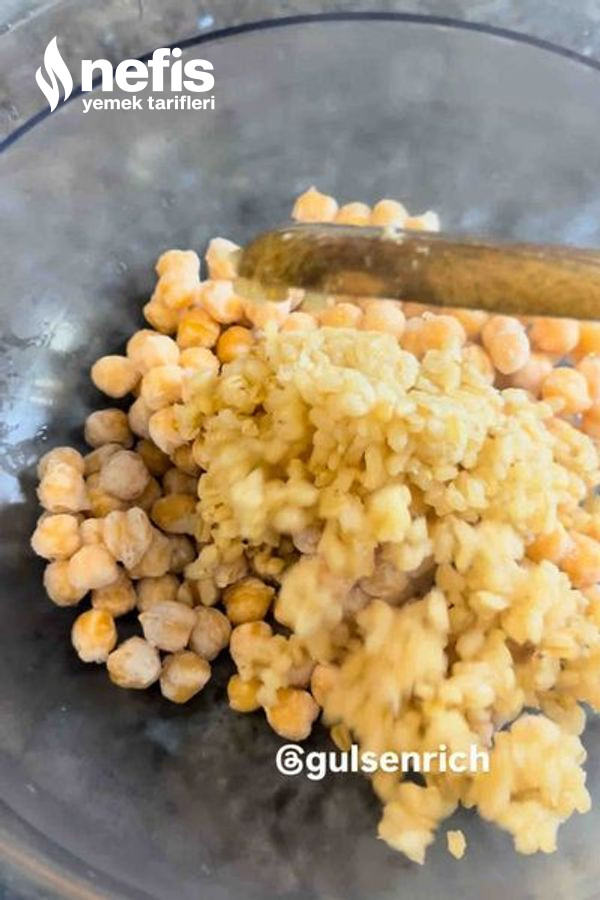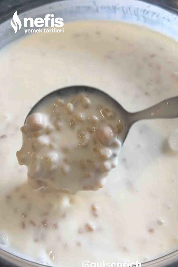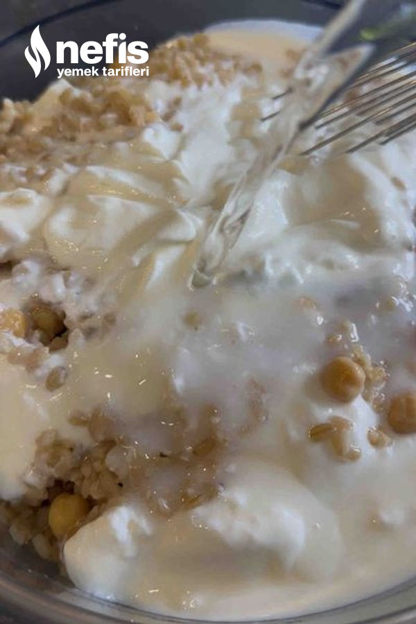 - Geniş bir kaseye haşlanmış ve soğumuş buğday ile nohutu bir kaseye alın, yoğurdu ek edin. Soğuk suyla karıştırarak kıvamını dilediğiniz kadar açın.