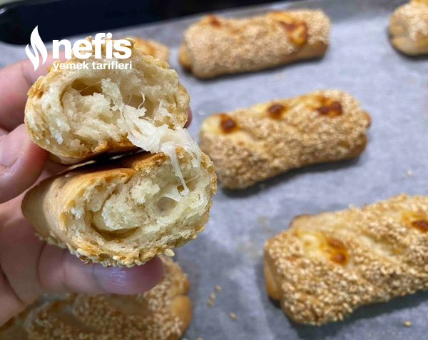 - Hamuru on iki eşit kesime bölelim. Her parçayı elimizle açıp, kaşar peyniri koyup saralım.