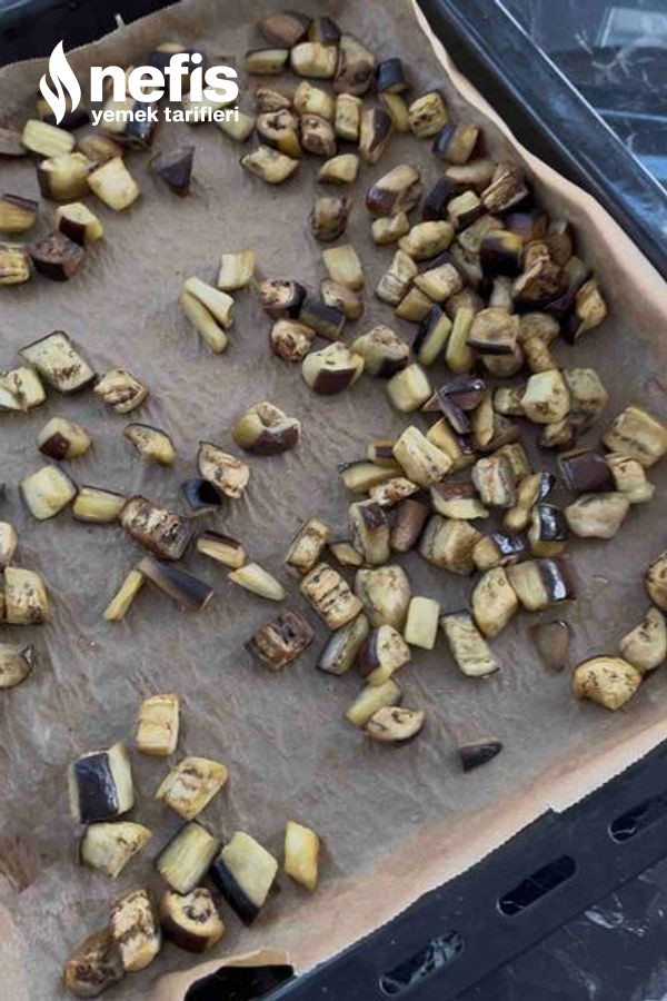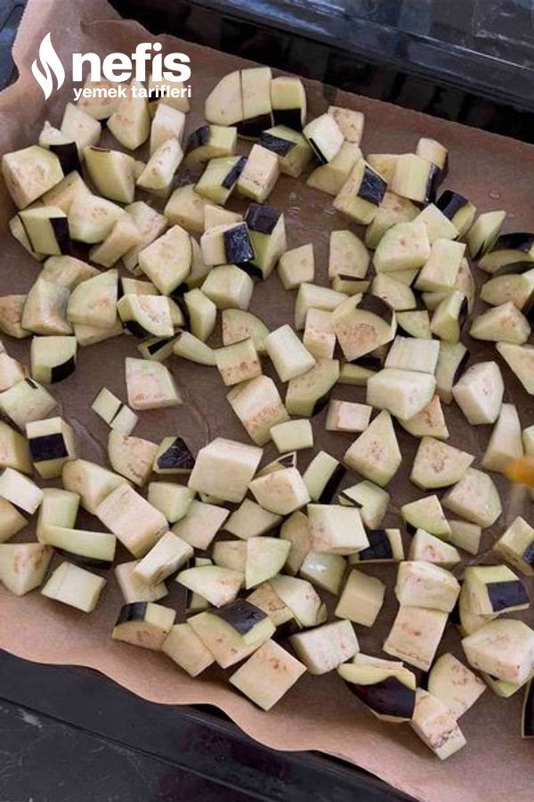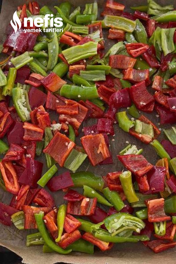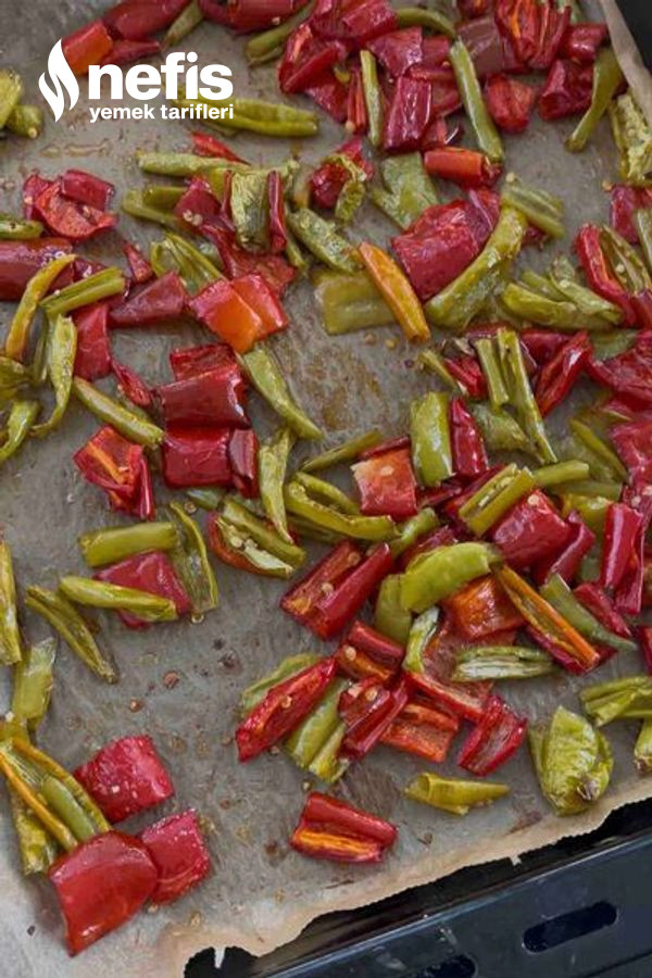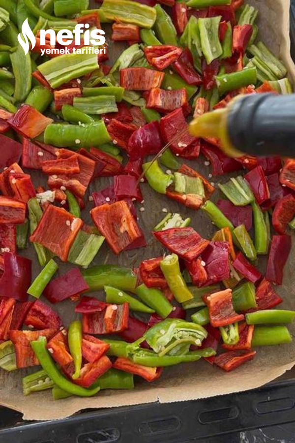 - Patlıcan ve biberleri fırın kağıdı serili iki başka tepsiye alalım, biraz sıvı yağ ve tuz gezdirip 190 derece ısıtılmış alt üst fırında kızartalım.