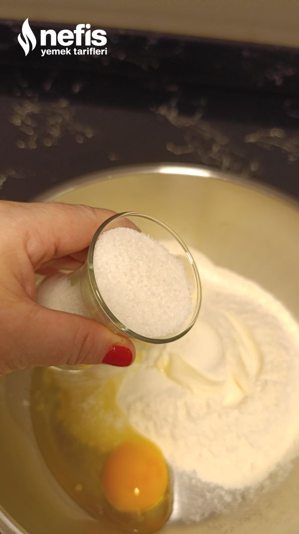 - Derin bir kaba unu ,tereyağı, toz şekeri ,yumurta ,kabartma tozu ve vanilini ekleyerek yoğuruyoruz.