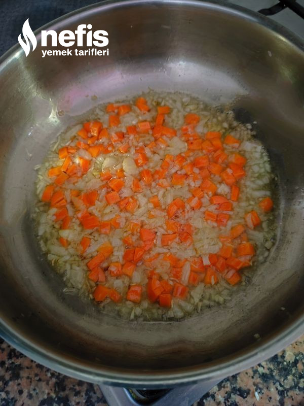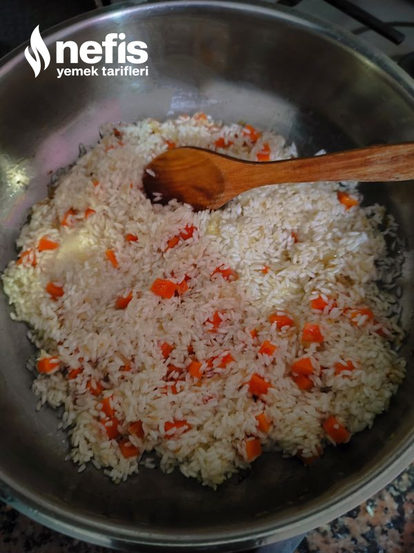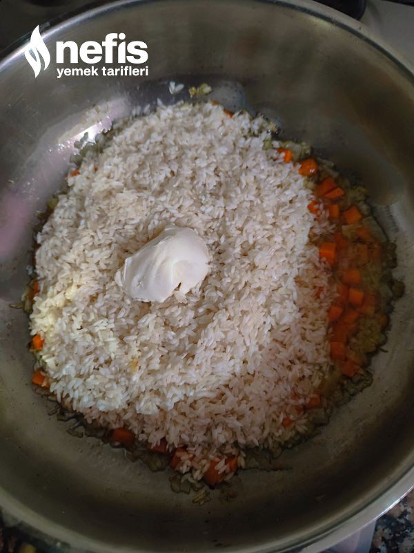 - Sonrasında üzerine küp küp doğranmış havucu ek edip biraz yumuşayınca üzerine pirinç ve tereyağını ekleyip bir iki dakika yavaşça kavuralım.