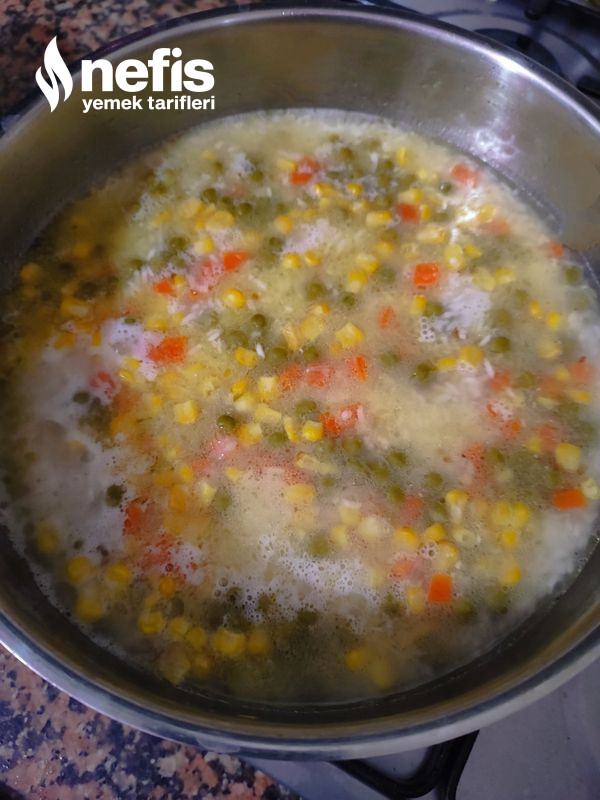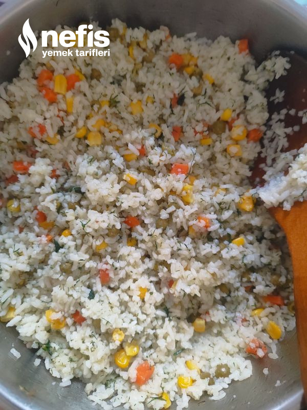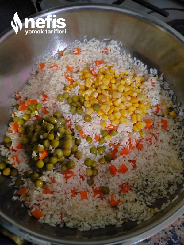 - Pirinçler kavrulduktan sonra bezelye ve mısır ek edip biraz karıştıralım.