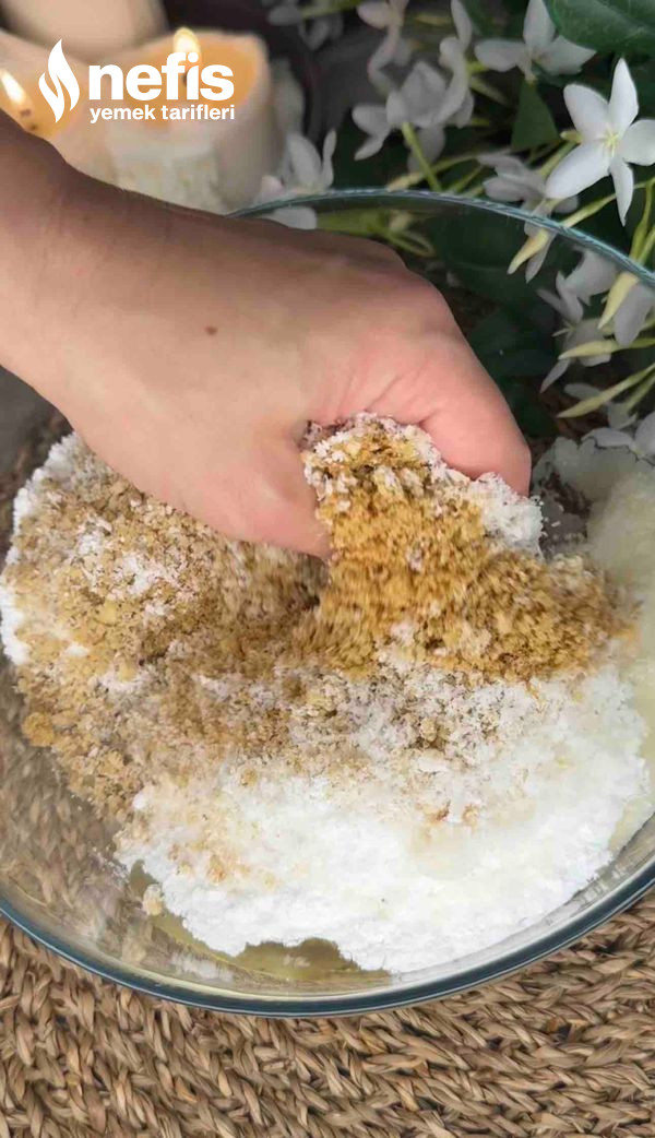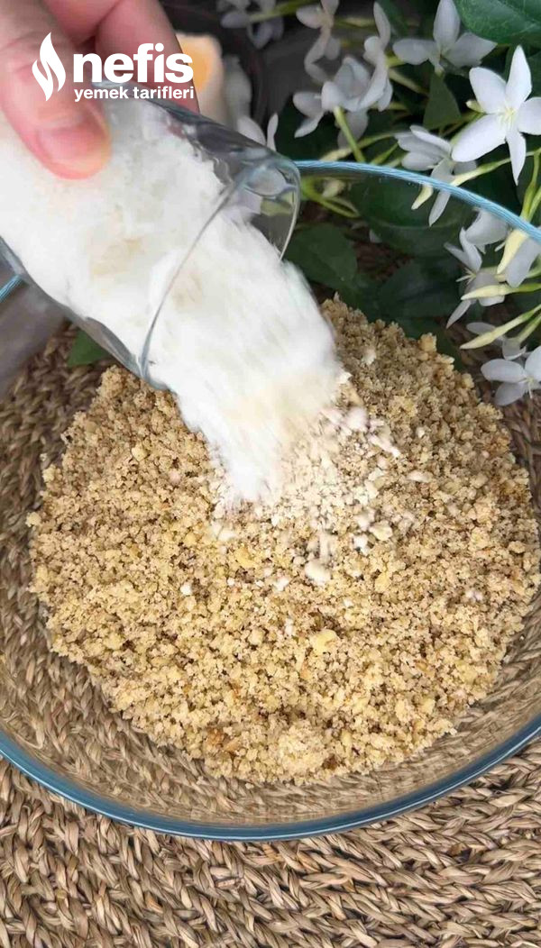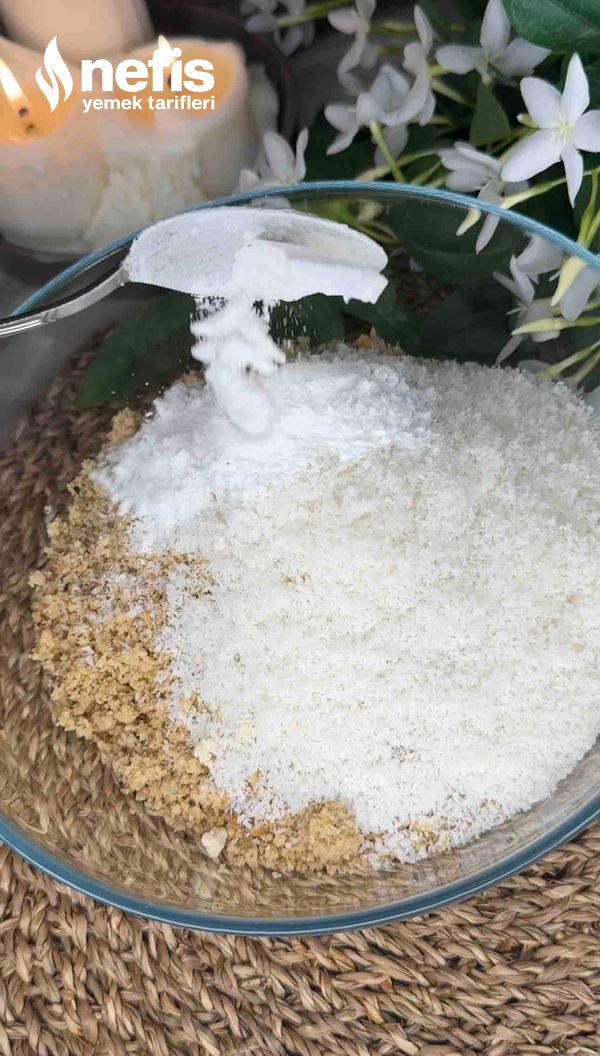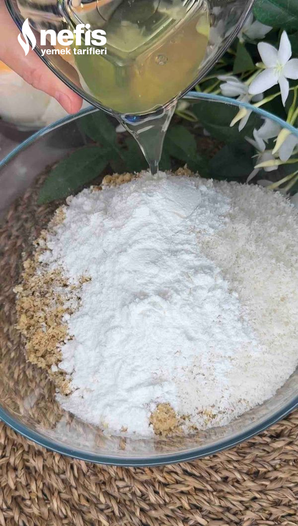 1. İlk olarak cevizi ve bisküviyi öğütüyoruz daha sonra içine pudra şekeri, hindistan cevizi ve yumurta akını ekliyoruz. Karıştırıp, yoğurup hamuru hazırlıyoruz.