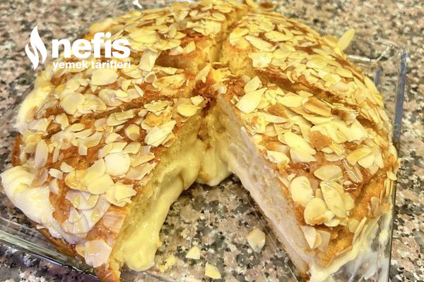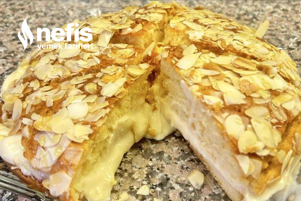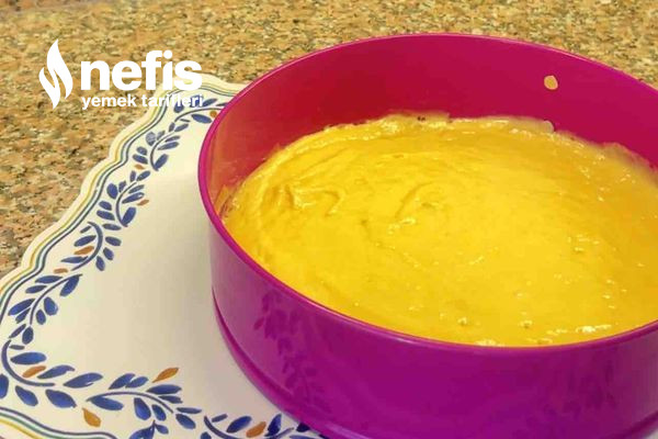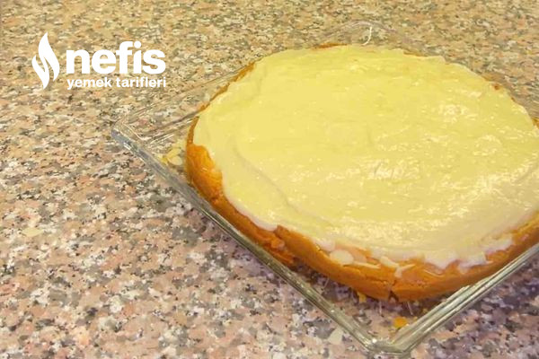 - Kek fırından çıktıktan sonra ortadan ikiye bölüp üzerine yapmış olduğumuz muhallebiyi döküyoruz.