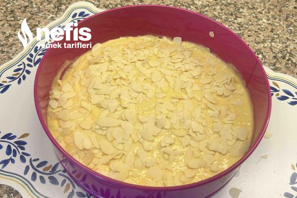 - Yuvarlak kek kalıbına harcı döktükten sonra üzerine file badem döküyoruz.