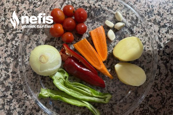 - Bütün sebzelerimizi yıkayıp durulayıp dilimledikten sonra bir fırın pişirme kabına alalım (soğan havuç patates domates biber sarımsağı bütün kullanabilirsiniz ).