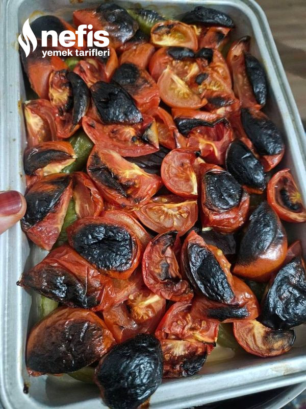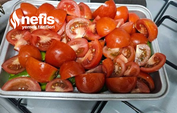 6. Üzerine 4’e bölünmüş domatesler kapatılır iki tepside evvelce ısıtılmış 200 derece fırına verilip pişirilir.