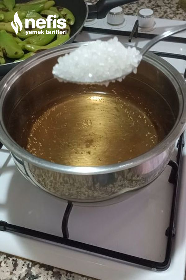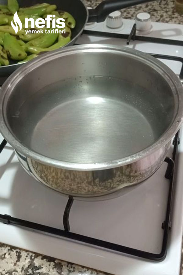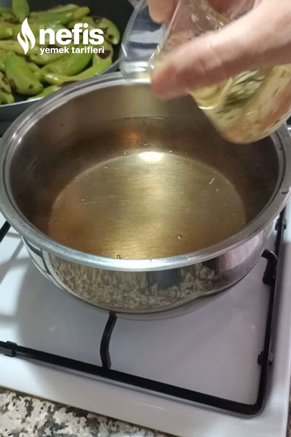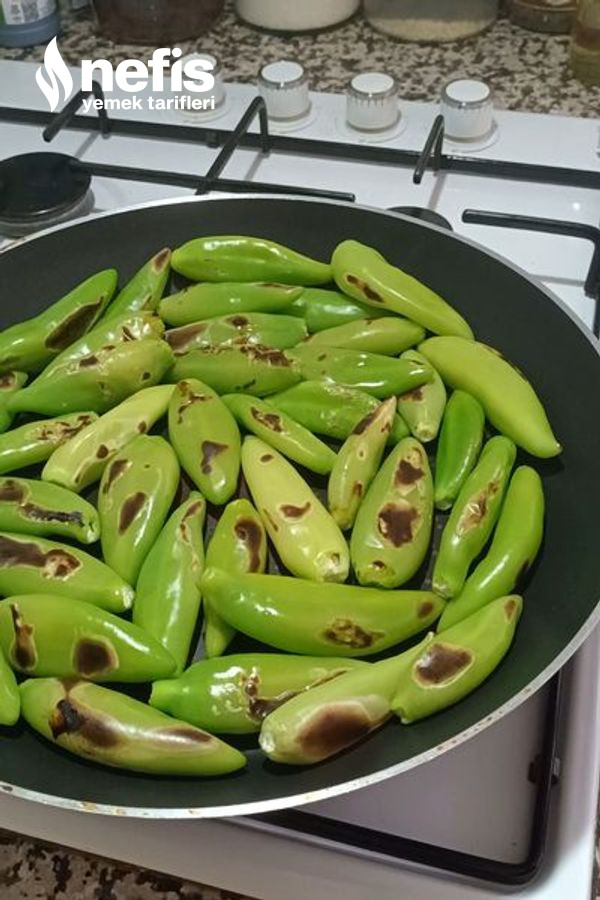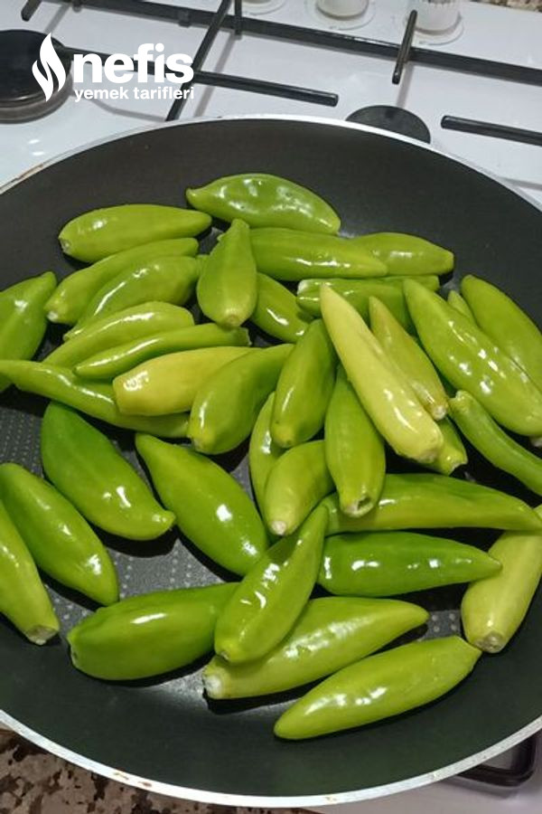 - Güzelce yıkayıp saplarını temizlediğimiz balık biberleri tavaya koyuyoruz.