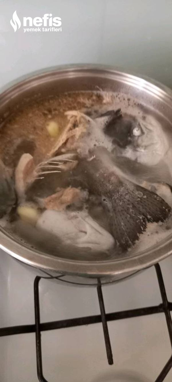 - Önce balığı temizleyin tüm olarak bir tencereye alın, iki diş sarımsak ve defne yaprağı ve bol su ile (ki ben çorbanın tüm suyunu balık suyu kullanıyorum) haşlayın.