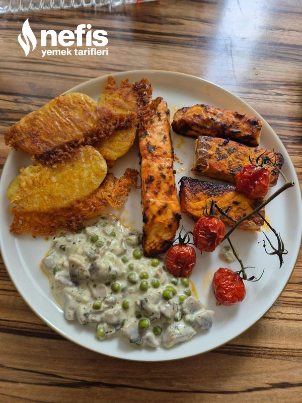 Balık Menüm Fırında somon Kiraz domates Fırında kaṣarlı patates Kremalı mantar (bezelyeli) Yanına salata ve yahut çorba ile servis edebilirsiniz. İlginizi Çekebilir:Dev Bisküvi Pastası