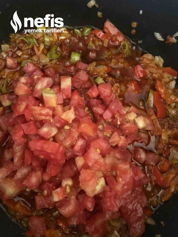 - Kabuklarını soyup küp doğradığın domatesleri ekleyin, 2–3 dakika pişirin.
