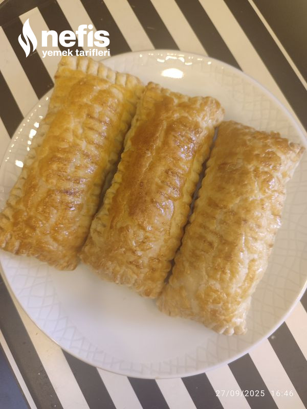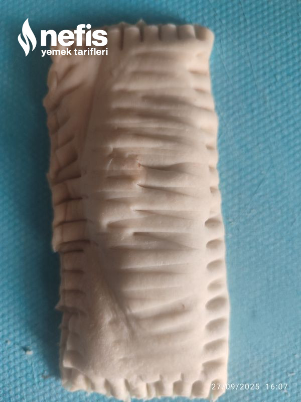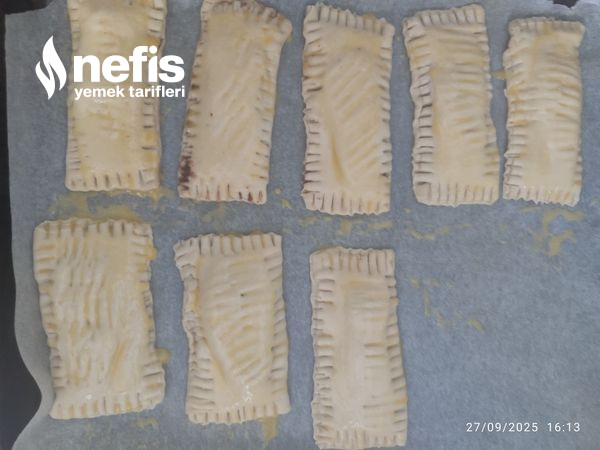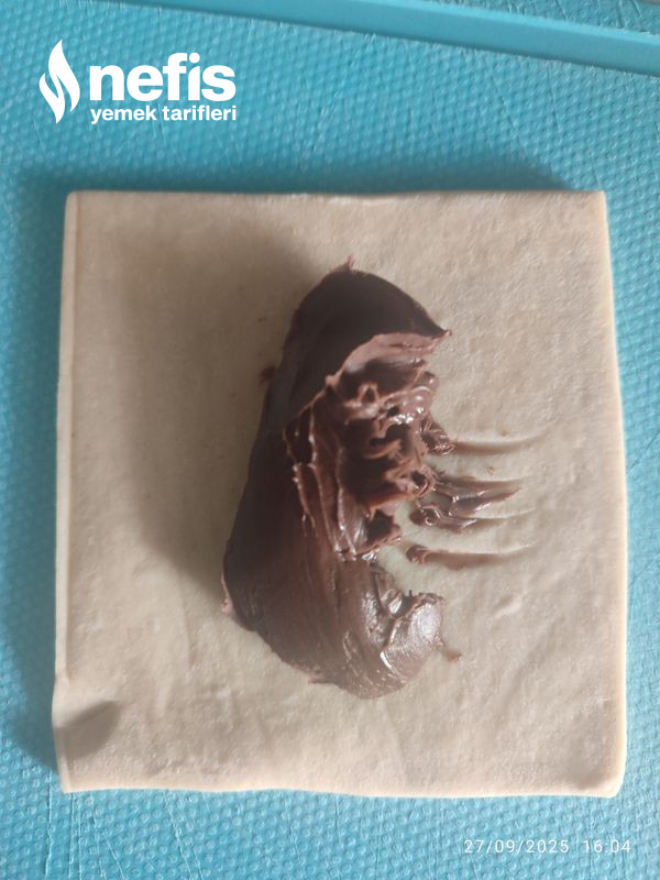 - Milföyleri ortadan ikiye kesiyoruz kare biçiminde sonrasında içine bir buçuk tatlı kaşığı çokokrem sürüyoruz, sonrasında ikiye katlayıp, kenarlarını çatalla açılmasın diye iz yapıyoruz fotoğraftaki üzere.