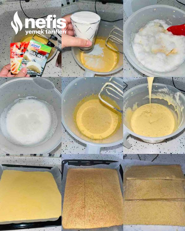 - Ayrı kapta sarısı ile şeker de çırpılır daha sonra sıcak su yağ katılır çırpılır, vanilya, kabartma tozu ve unda eklenir uygunca çırpılır.