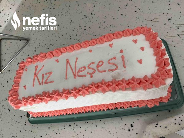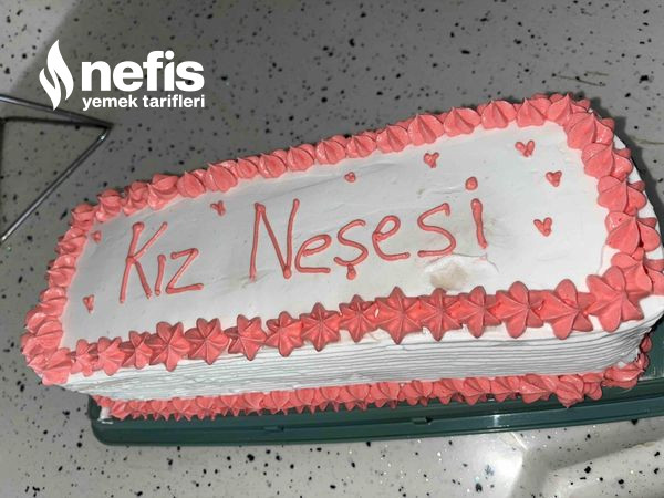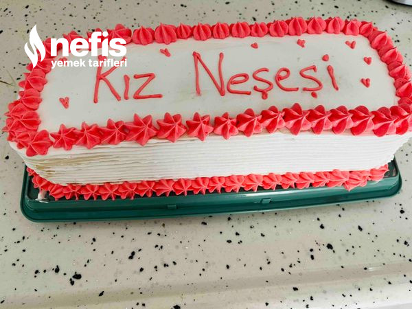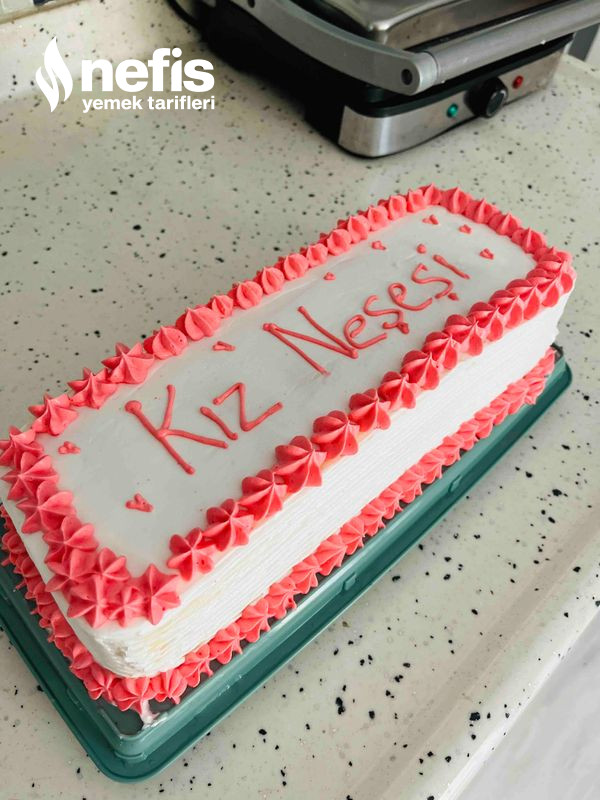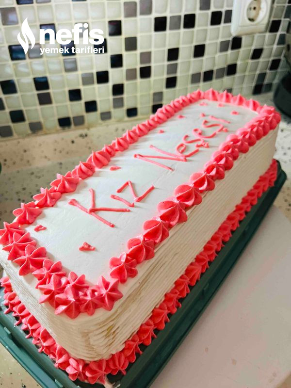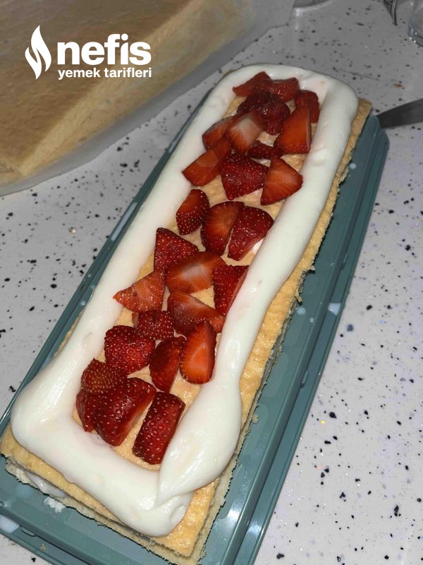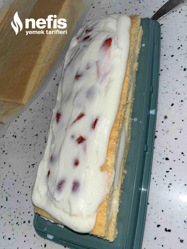 - İkinci katta sütle ıslatılır çilek eklenir ve üçüncü kata da tıpkı süreç yapılır kremşanti ile pasta kaplanır. Süslemek içinde kremşantiden biraz ayırıp çay kaşığının ucuyla pembe besin boyası eklenir ve pembe renkli şantiyle süslenir.