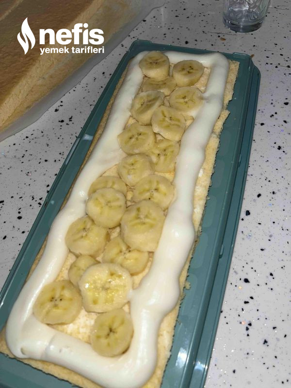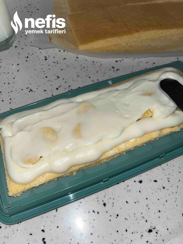 - Ayrı kapta kremşanti süte katılıp mikserle çırpılır. Kek 3 eşit modüle kesilir. Kek sütle ıslatılır birinci kata krema sürülür muz eklenir