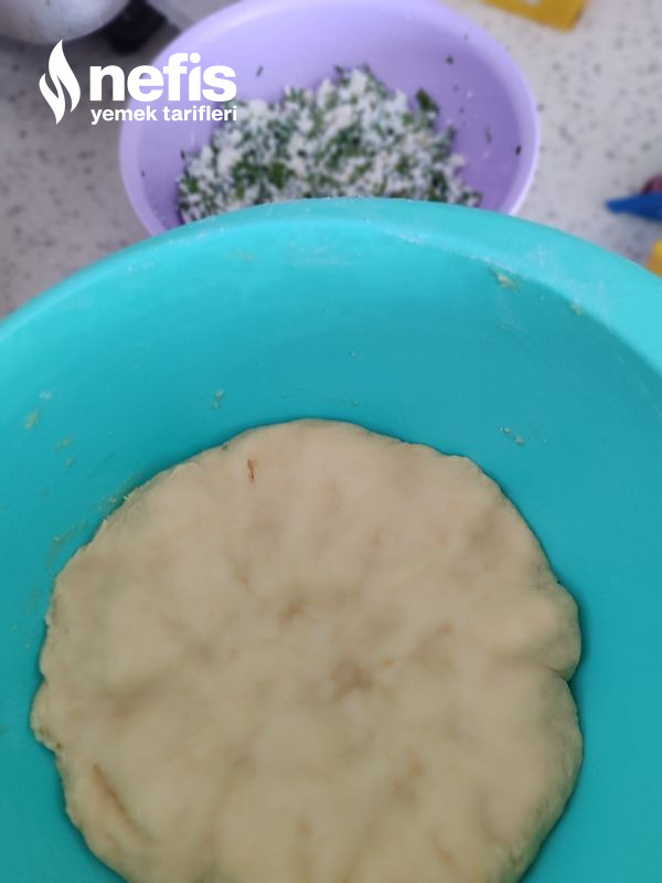 - Yoğurma sürecimiz bittikten sonra hamurumuz 5 dakika dinlendiriyoruz o sırada hem iç harcımızı hazırlıyoruz hem de 180 derecede fırınımızı evvelce ısıtmak için açıyoruz.