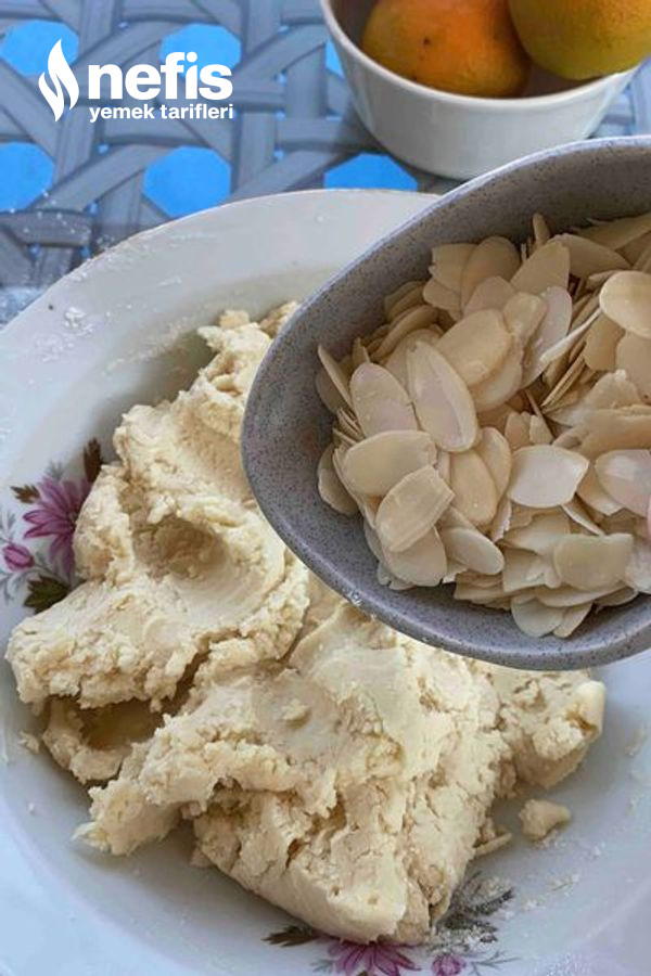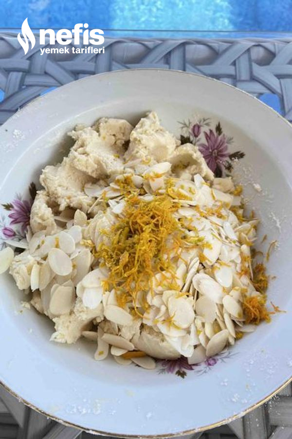 - Nişasta, tuz, un ekleyip karıştırın. ( Ele yapışmayan yumuşak bir hamur olacak. Unu denetimli ek edin. ) file badem ve portal kabuğu rendesini ekleyip, karıştırın.